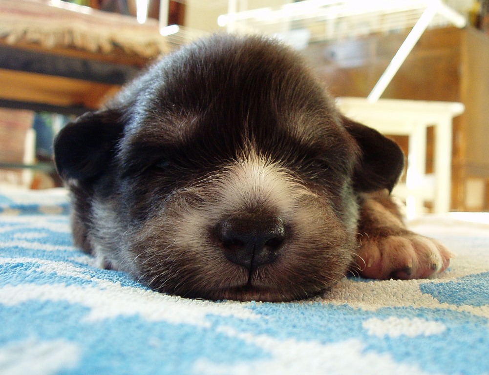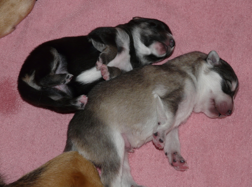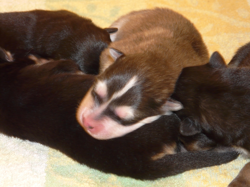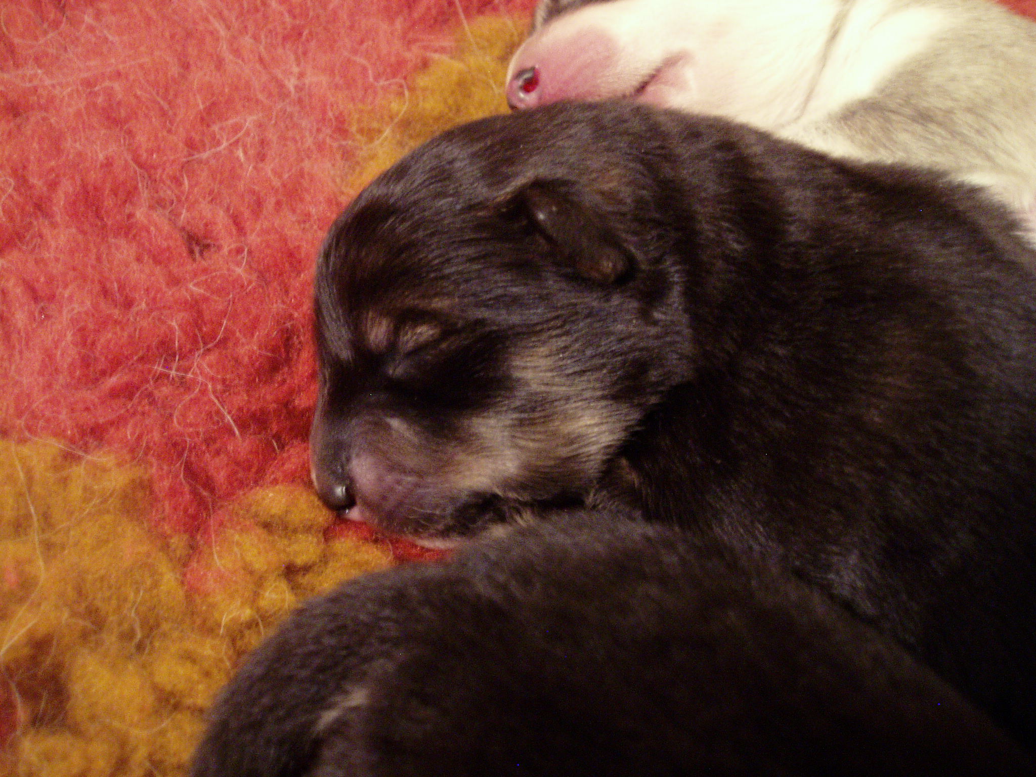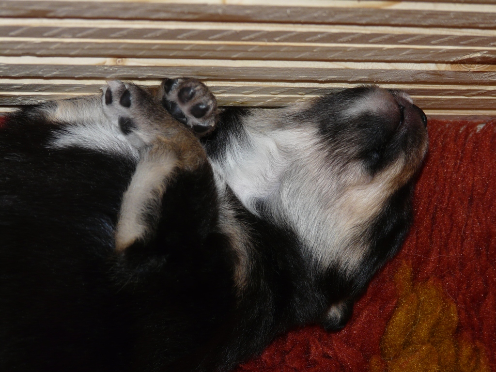 odottamassa 'tarkempaa' lukemista. Iso osa pentujen ajasta menee nukkumiseen, jonka katkaisee aika ajoin imemistuokio. Joskus tuntuu, että ne ovat vartin välein ruokailussa, ja jokainen oman kellonsa mukaan. Oheisessa kuvassa Vili ja Taisto mittaavat nukkuessaan nenien kokoa, muussa kokovertailussa Taisto viekin sitten voiton 6-0. Taiston hännänpään valkoinen pilkkukin on isompi kuin Vilillä, Vilin on kyllä somempi. Pentujen kynnetkin on ensimmäistä kertaa leikattu, ettei äiti-koiran vatsassa oleva, sinänsä hyvin parantunut leikkaushaava joutuisi liian koville. |