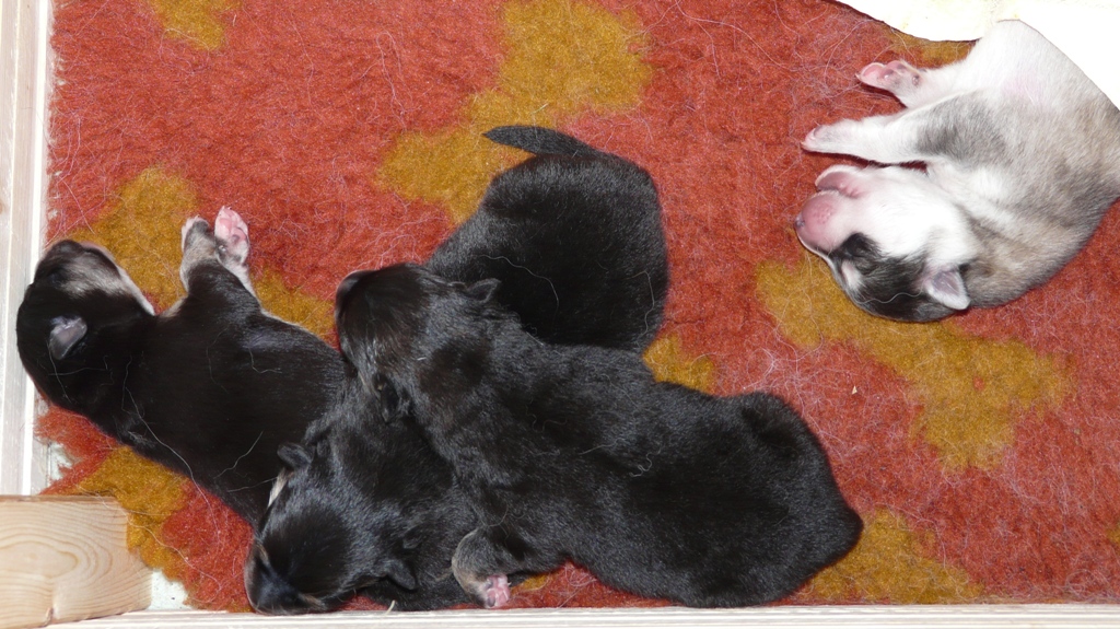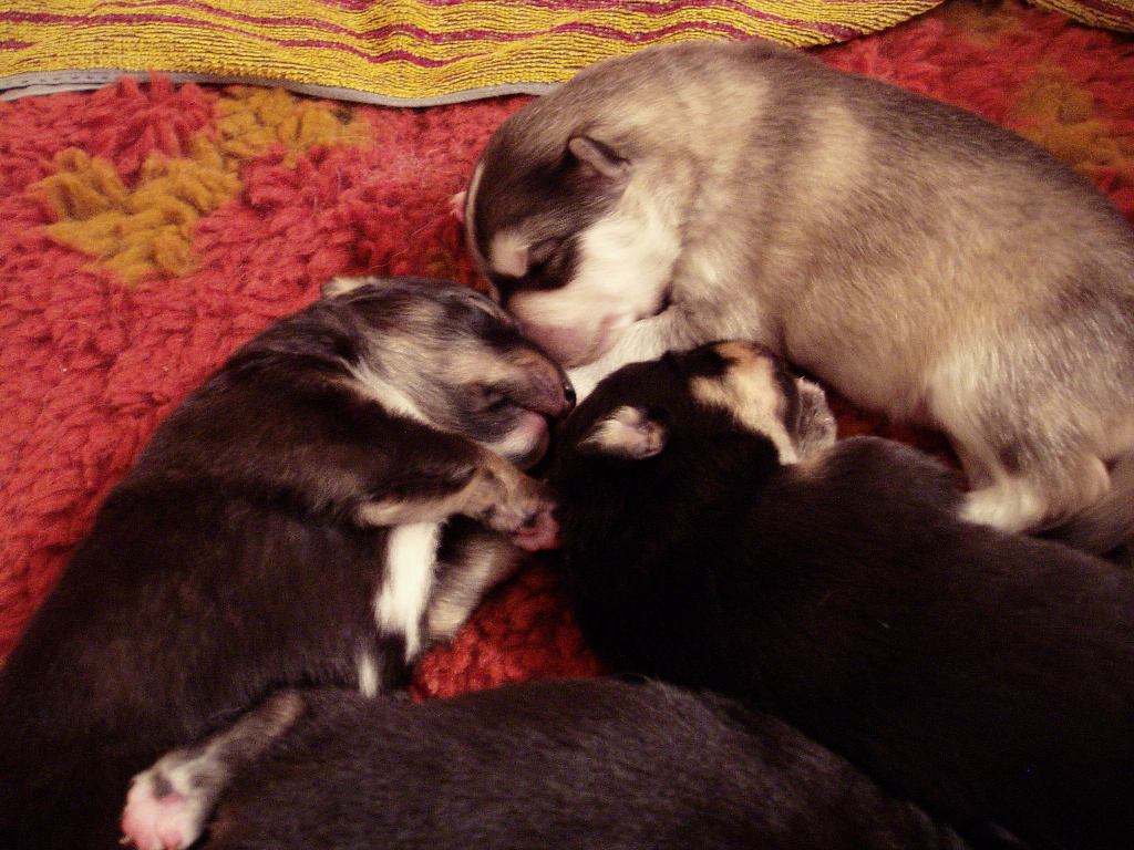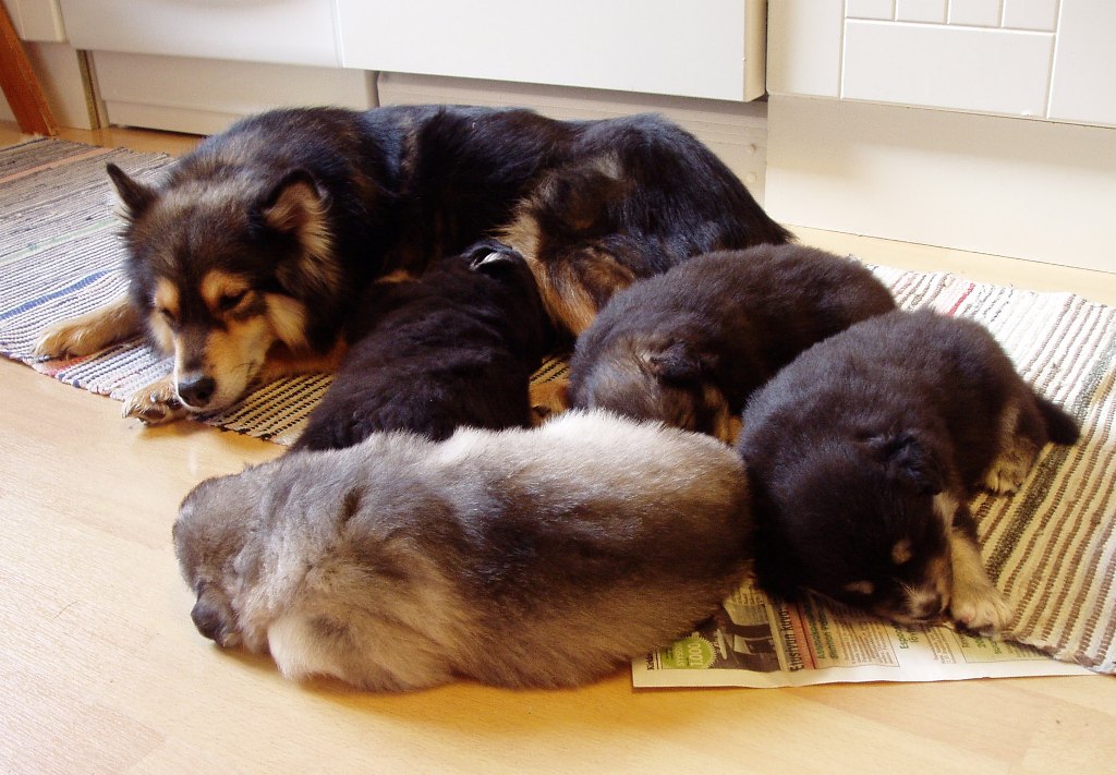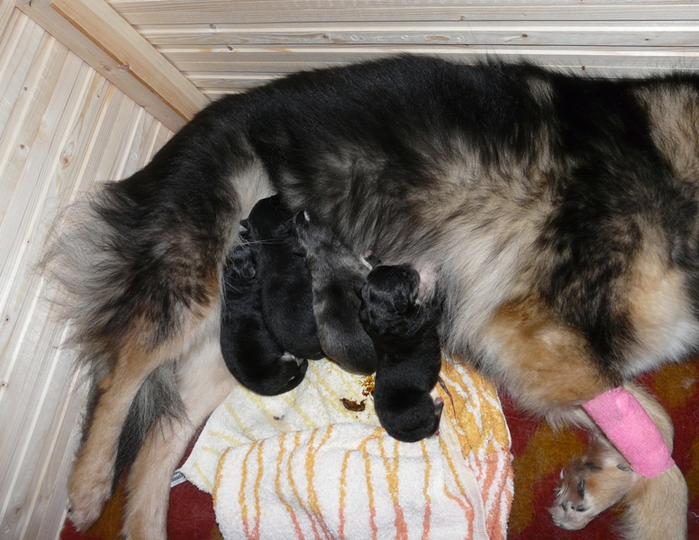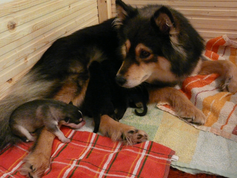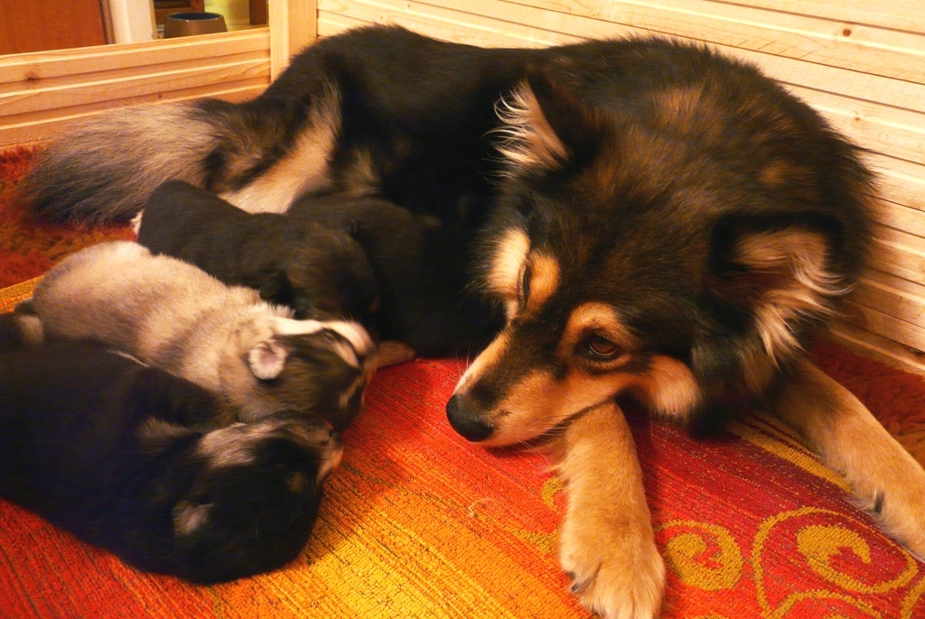 Tiistai-aamuyöllä 04:45 tapahtui ihme, Nelli asteli koppaan ja aloitti pentujen nuolemisen, kellahti kyljelleen ja pentujen ininä vaihtui lutkutukseen. Ja siitä lähtien Nelli on hoitanut äidin velvollisuudet erittäin kiitettävästi, mahan alustat on nuoltu, eritteet on siivottu ja maitoa tuotettu niin että vauvahauvat ihan kasvavat silmissä. Ruokailut tapahtuvat vain ja ainoastaan vauvalaatikossa, ulkoa tullessa on kova kiire vauvoja katsomaan.