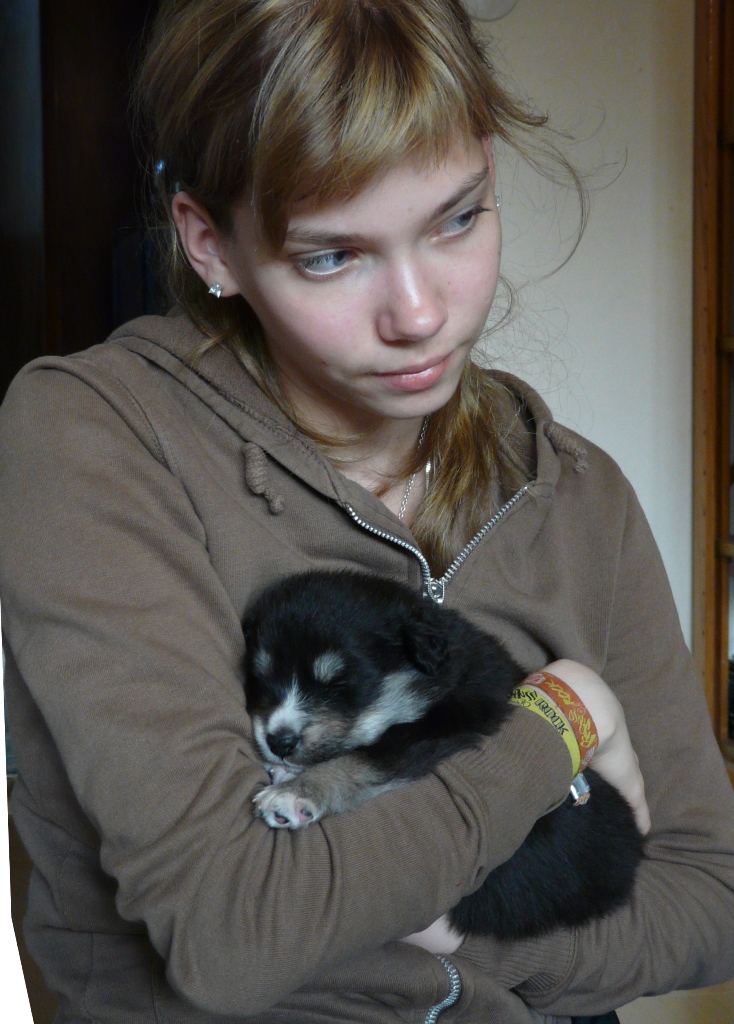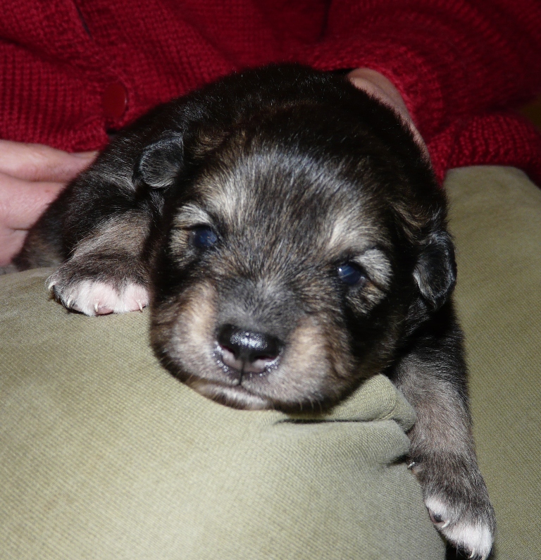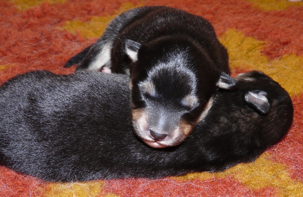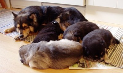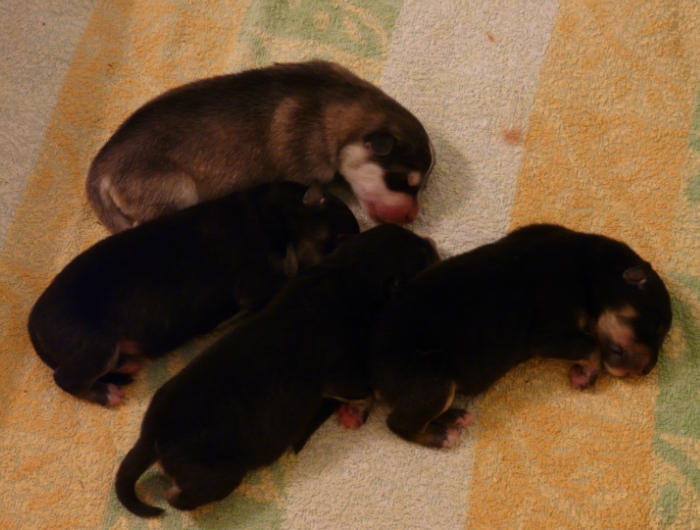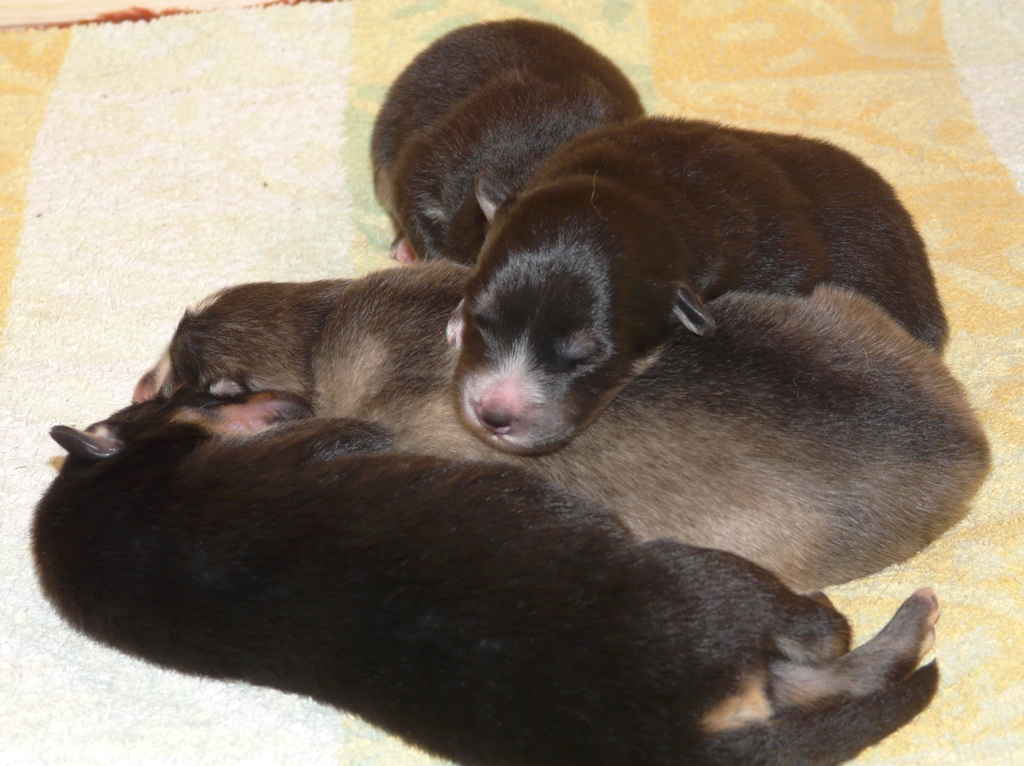 Tiistai-aamuyöllä 04:45 tapahtui ihme, Nelli asteli koppaan ja aloitti pentujen nuolemisen, kellahti kyljelleen ja pentujen ininä vaihtui lutkutukseen. Ja siitä lähtien Nelli on hoitanut äidin velvollisuudet erittäin kiitettävästi, mahan alustat on nuoltu, eritteet on siivottu ja maitoa tuotettu niin että vauvahauvat ihan kasvavat silmissä. Ruokailut tapahtuvat vain ja ainoastaan vauvalaatikossa, ulkoa tullessa on kova kiire vauvoja katsomaan.