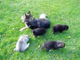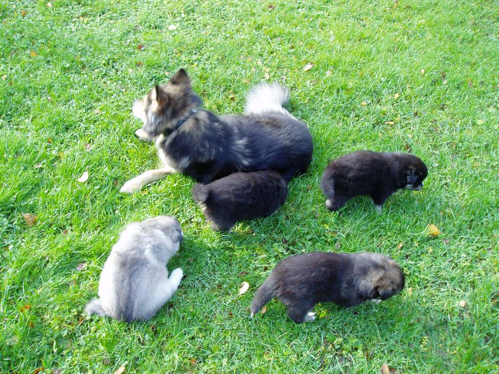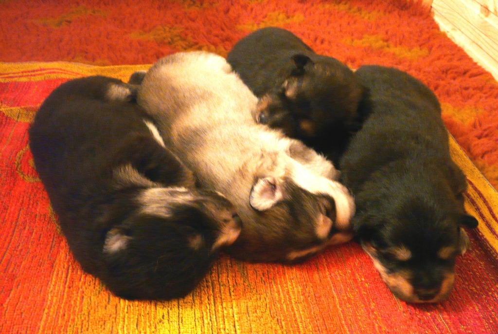 Viidennen viikon aluksi pennut pääsevät ensimmäistä kertaa ulkoilemaan. Pari ensimmäistä kertaa on uuden ihmettelyä ja pelottavaakin, mutta kolmannen kerran jälkeen pentujen paimentaminen käy jo hyvästä perusliikunnasta. Ulkoilun jälkeen maittaa uni, varsinkin ensimmäisen ulkoilukerran ja tassujen pesun jälkeen äiti-Nellin läheisyyteen oli ihan pakko päästä nukkumaan. |