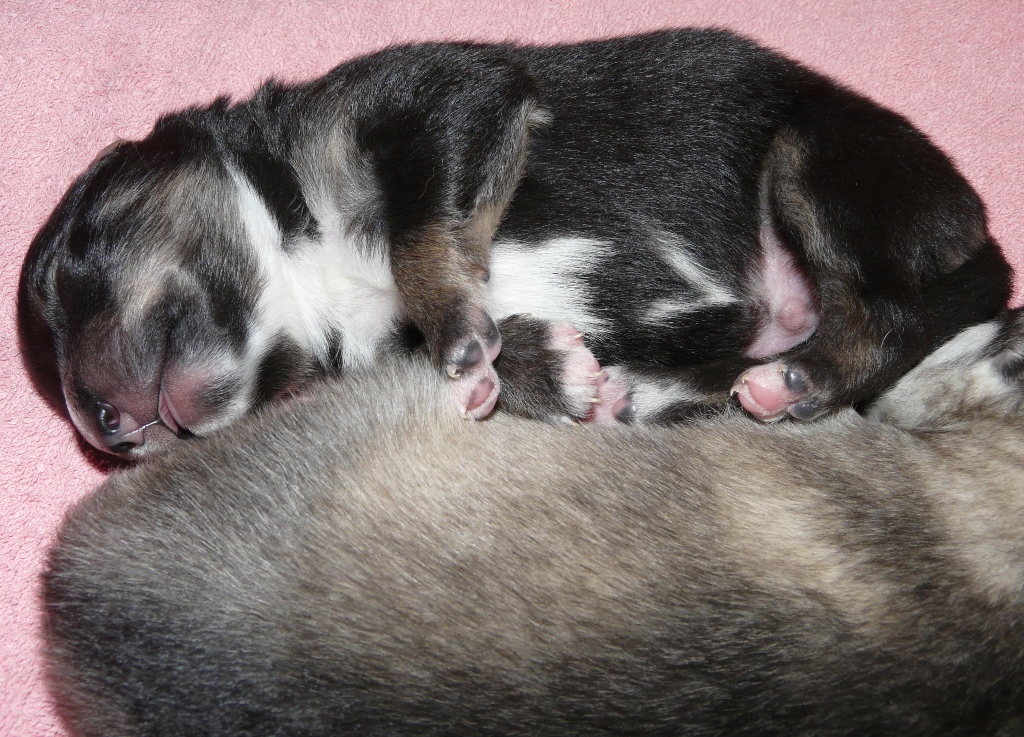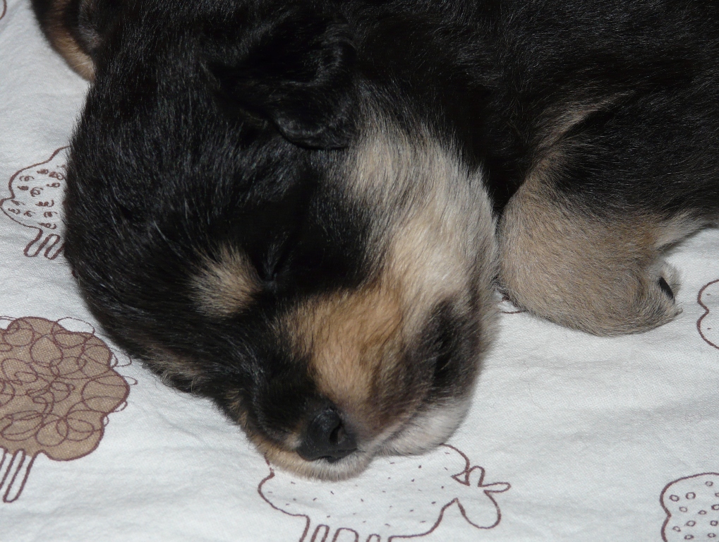 Keskiviikkona oli olo jo tasaantunut, sekä meillä että pentulaatikossa. Nelliä oli edelleenkin vaikeahko saada lähtemään ulos, ja pentuihin kohdistuvia toimenpiteitä se tarkasteli kriittisesti. Pentukuvaamiset ja punnitukset siirrettiinkin sitten siihen aikaan, kun emo oli ulkona. Salamavaloon pennut kyllä reagoivat, vaikka silmät eivät vielä ole auenneet. Suurin osa pentujen ajasta kuluu nokosten vetämisessä.