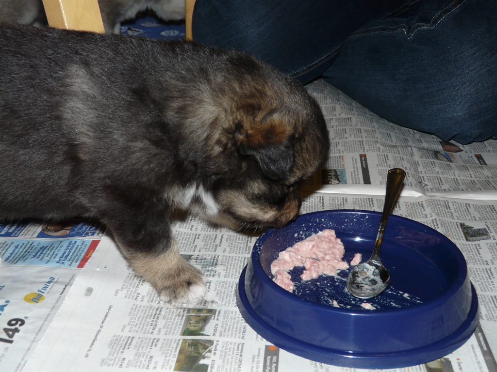 Hesarit loppuu, pentulaatikon ympäristö on peitettu sanomalehdillä, jonne aika kuuliaisesti pennut käyvät tekemässä heräämisen jälkeiset lorotukset. Tytöt kyllä välillä luulevat pelkkien etujalkojen siirtämisen laatikon ulkopuolelle riittävän.