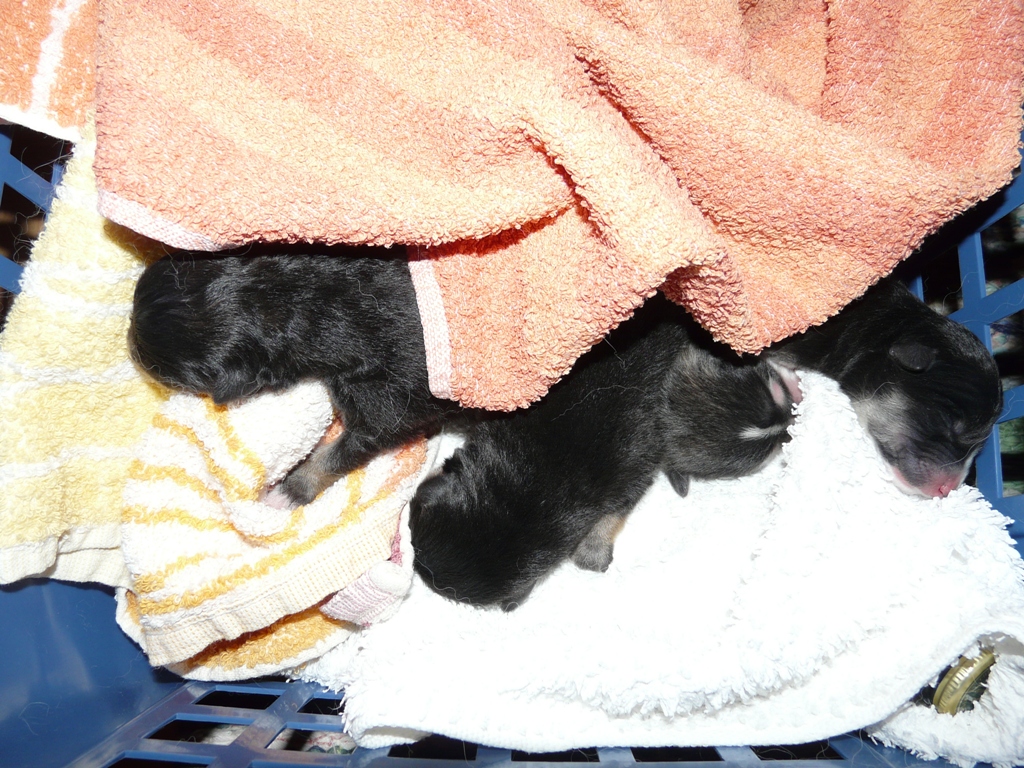 Niinpä mentiinkin ja meitä tervehti 'kauhea' ulina jo odotustilassa. Leikkaus oli mennyt hyvin, kaikki 4 pentua olivat hyvässä kunnossa (2+2), Nellin ompelussa menisi vielä jokin aikaa, sen ajan meidän piti pitää huolta jälkikasvusta. Olimme viisaasti varanneet mukaan kopan, paljon pehmeitä pyyhkeitä ja muutaman tyhjän muovisen viskipullon (Tullamore Dew:tä, tottakai). Siinä ne sitten Eddin ja Nellin jälkeläiset köllöttelivät ja ääntelivät lämpimässä kuumavesi-laatikossa ja olivat kovin, kovin liikkuvaisia ja hyvin erilaisia kuin mitä oletimme niiden olevan. Nellin jälkihoito kesti aika tovin, Meri-Tuulilla apureineen meni ylitöiksi, vuotava kohtukin jouduttiin poistamaan. Apteekissakin piti varoiksi käydä koirien äidinmaitovastiketta hakemassa ja vasta ilta kymmenen jälkeen sain kantaa tokkurassa olevan Nelli-äidin Volkkarin takapenkille kotimatkaa varten. Ennen kotimatkaa oli parkuvat koiravauvat hiukan saatu rauhoittumaan, kun niille opetettiin imemistä. Tuore äiti vain ei ollut kuin fyysisesti mukana toimituksessa, joka ei ollutkaan ihan helppo homma. Kokeilkaa itse silmät kiinni, pelkän haju- ja tuntoaistin perusteella !