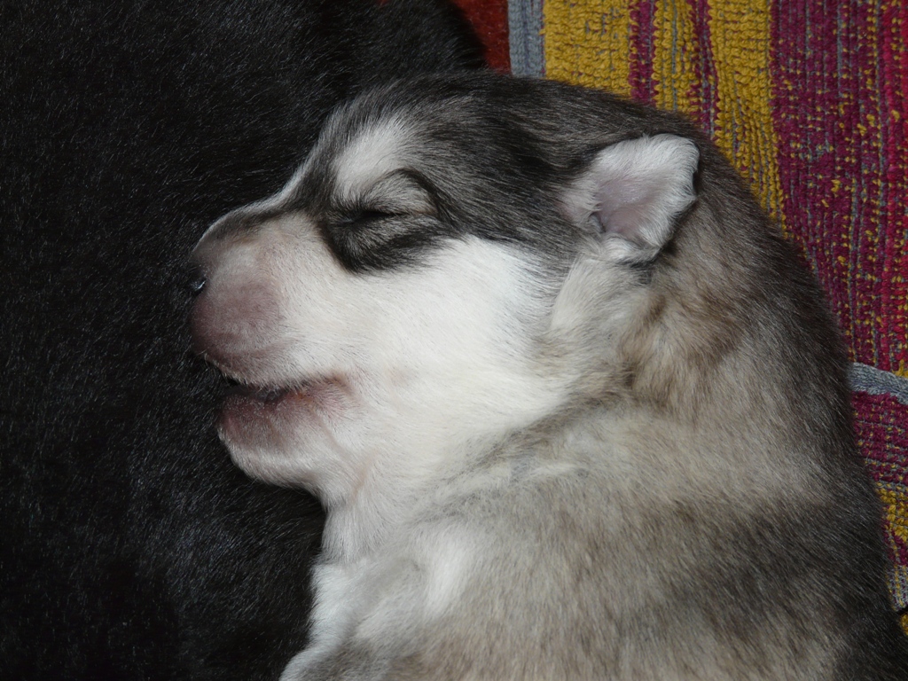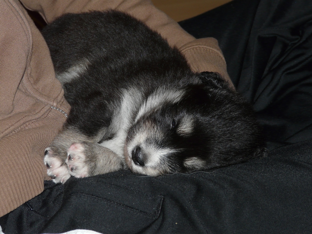 Tässä Lennu päiväunilla, niitä on kolmannella viikolla vielä yhtä paljon kuin aikaisemminkin. Oikealla olevan pennun väritys taitaa olla jo lukijoille tuttu, sehän on Taisto. |